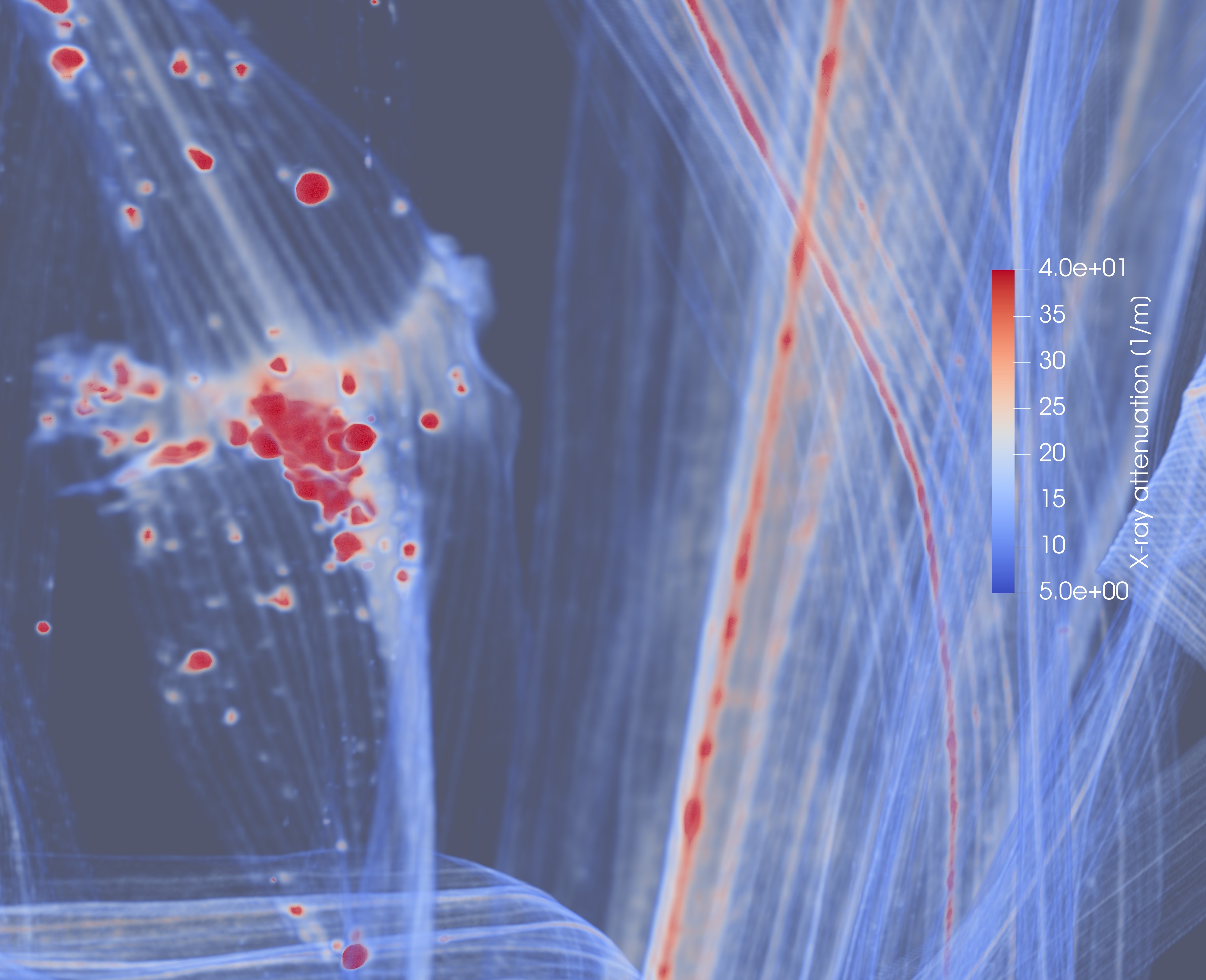 The soils that this plant was grown in contain 13000 mg/kg Pb. The XCT image (showing areas of density above 10g/cm3 in red) allows us to differentiate between parts of the plant with normal density (2-4 g/cm3) and parts that may contain high density metals such as Pb (11.3 g/cm3). Over the course of the CERESiS project we aim to gain an understanding of whether the contamination found in biomass analysis is simply dust on the surface of the plant or actually contaminants absorbed within the biomass. This will then inform pre-treatment options for turning contaminated biomass into biofuels.